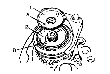 13. Install 5th synchronizer hub plate (1) to synchronizer hub (2) by positioning it so that its lugs A fit into their depression B in synchronizer hub.