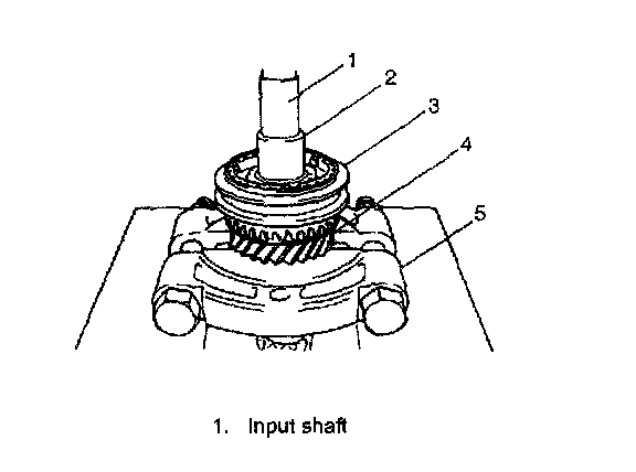 Disassembly1. Drive out 5th gear spacer (2), left bearing (3) and 4th gear (4) all at once by using puller (5) and hydraulic press.