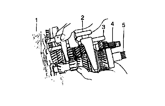 Reassembly1. Join input shaft (5), countershaft (4), low speed gear shift shaft (2) and high speed gear shift shaft (3) assemblies all together, then install them into right case (1) so as not to damage oil seal by input shaft spline.