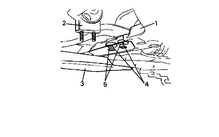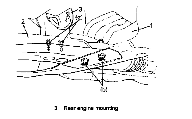 7) Remove engine rear mounting (2) nuts and engine mounting member (3) bolts to separate member from suspension frame (1).