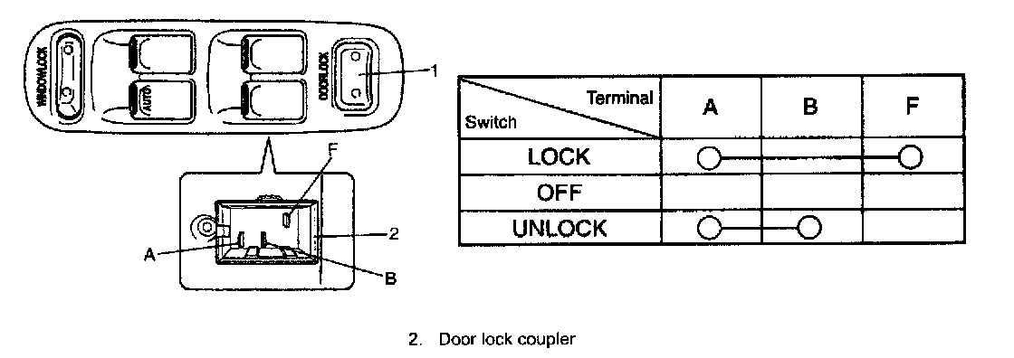 Inspect continuity at terminals according to the door lock switch (1) action.