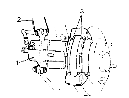 NOTE: Hang removed caliper with a wire hook (2) or the like so as to prevent brake hose from bending and twisting excessively or being pulled. Don't operate brake pedal with pads (3) removed.