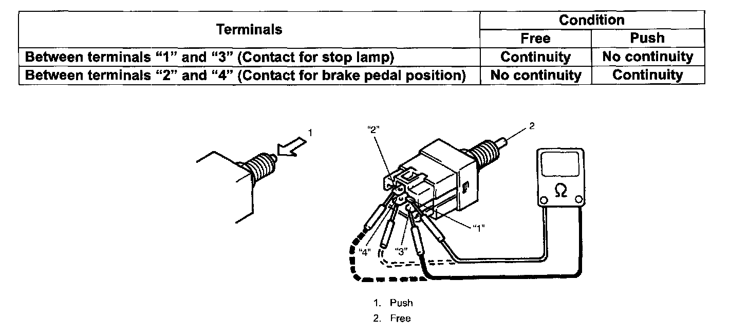 3. Check switch (two contacts) for resistance under each of the following each conditions. If check result is not satisfactory, replace stop lamp switch.