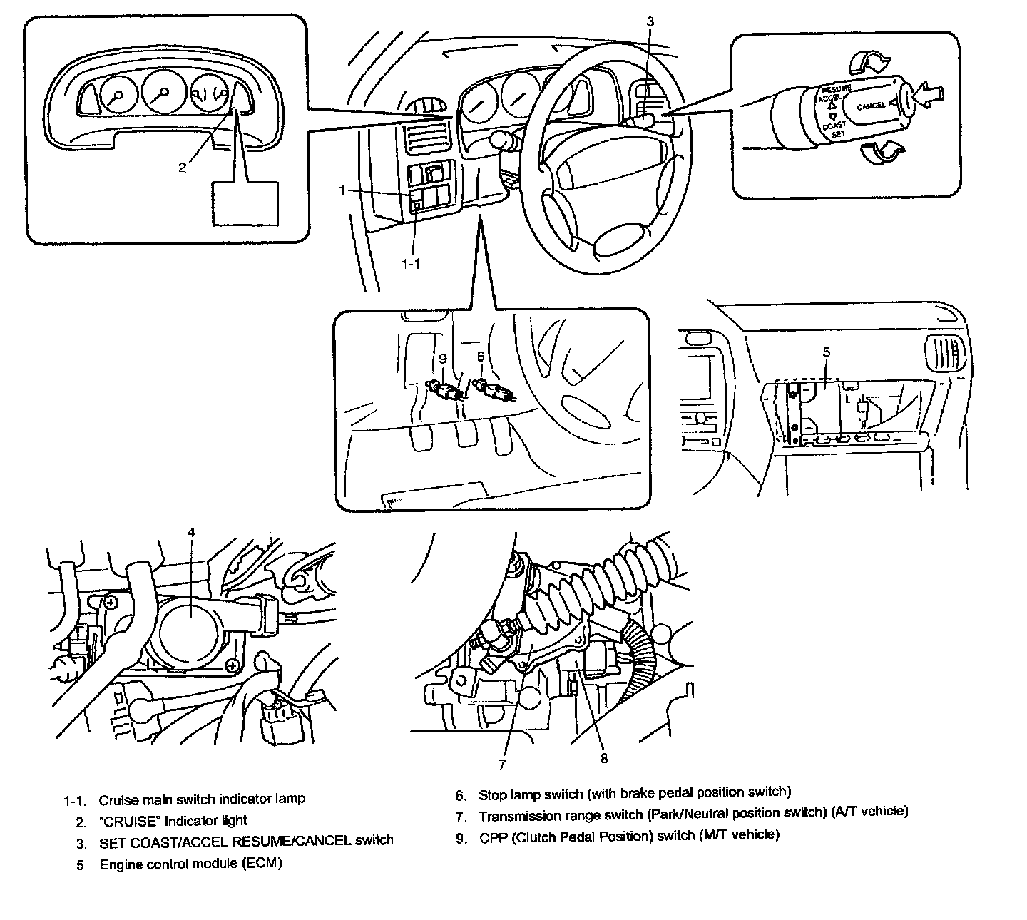 The cruise control system is a device which maintains a preset vehicle speed while driving at a high speed, e.g., on a highway. It allows the driver to drive his vehicle at a constant speed of 40 km/h (25 mile/h) or higher without depressing the accelerator pedal (constant cruising). The system also has such functions as to change the vehicle speed without operating the accelerator pedal (but using SET COAST and ACCEL RESUME switches), cancel cruise control (CANCEL switch) and resume the speed in memory automatically after cruise control is cancelled (ACCEL RESUME switch). The system mainly consists of a vehicle speed sensor (8), an actuator assembly (4) incorporated with control module, cruise main switch (1), SET COAST switch, ACCEL RESUME switch and CANCEL switch, etc.