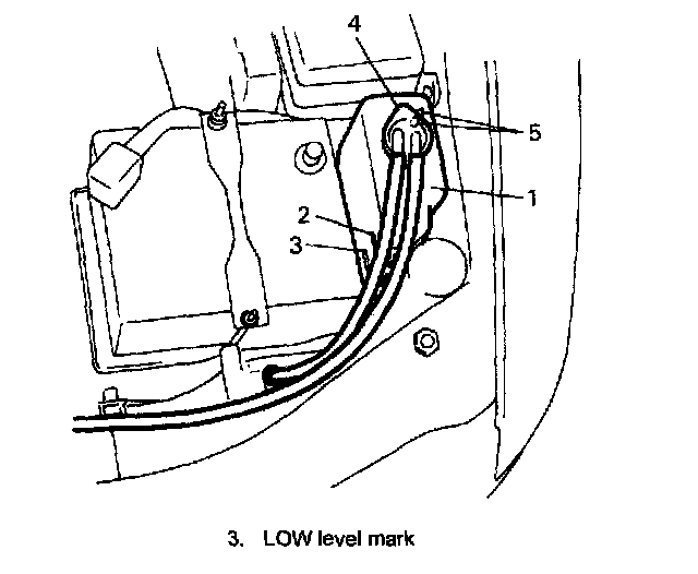 8. Add 50/50 mixture of good quality ethylene glycol anti-freeze and water to radiator and tank (1). Fill radiator to the base of radiator filler neck and reservoir tank to "FULL" level mark (2). Reinstall reservoir tank cap (4) and align match marks (5) on tank and cap.