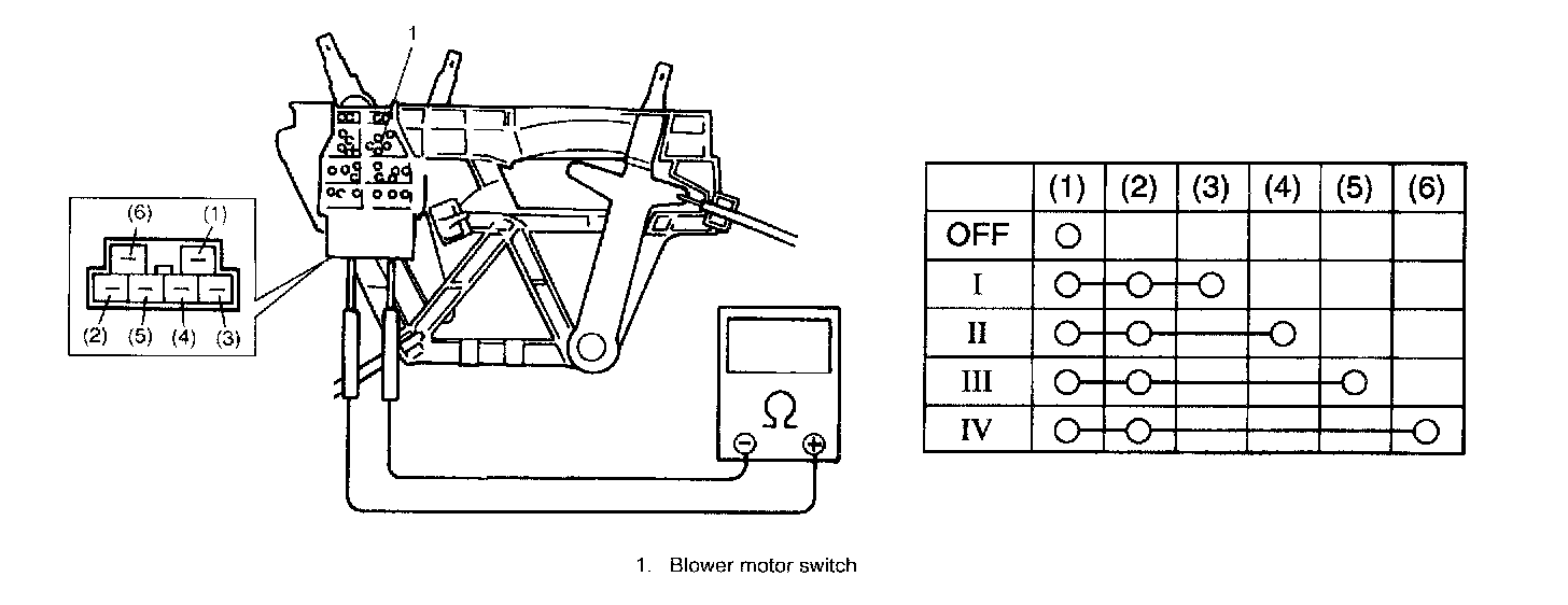 Check switch for each terminal-to-terminal continuity. If there is no continuity, replace heater control lever assembly.