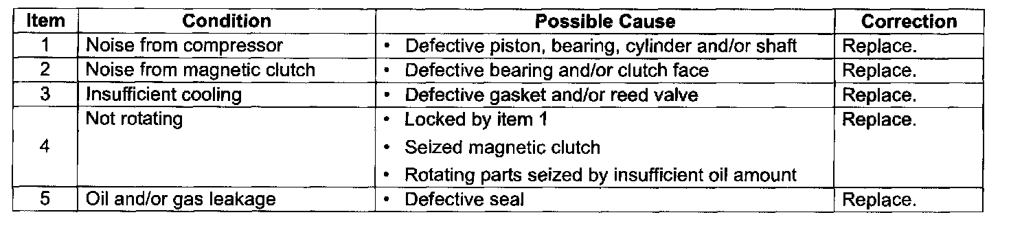 Compressor troubles are mainly the following three types: gas leakage, noise and insufficient pressure. Compressor gas leakages in most cases develop from the shaft seal. When detecting gas leakage, always use a leak tester. If a small amount of oil seeps out from the shaft seal, there is no necessity of replacing the seal. The shaft seal has been designed to allow a small amount of oil to leak out for lubricating purpose.