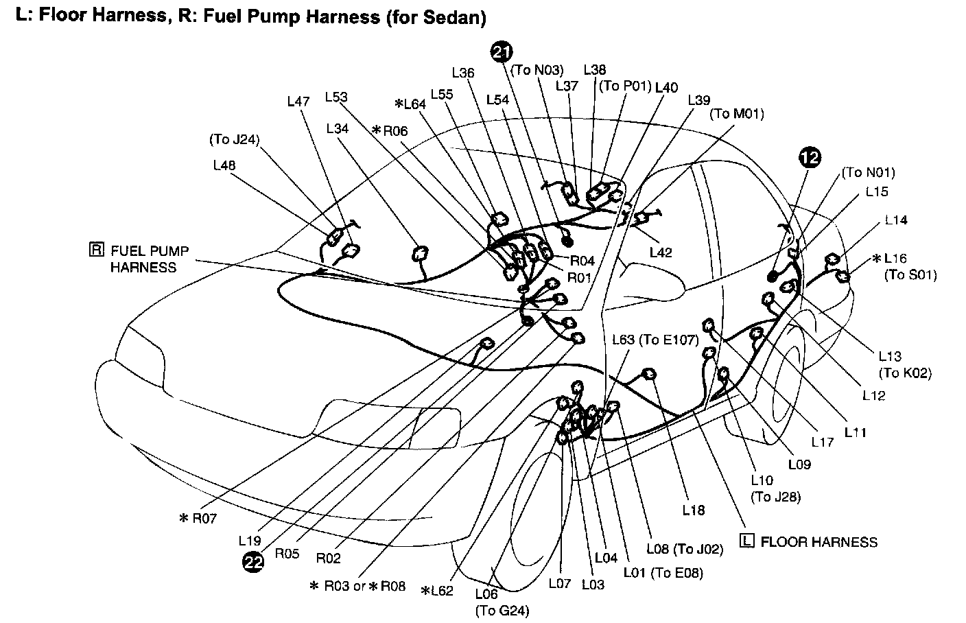 L: Floor Harness, R: Fuel Pump Harness (For Sedan):