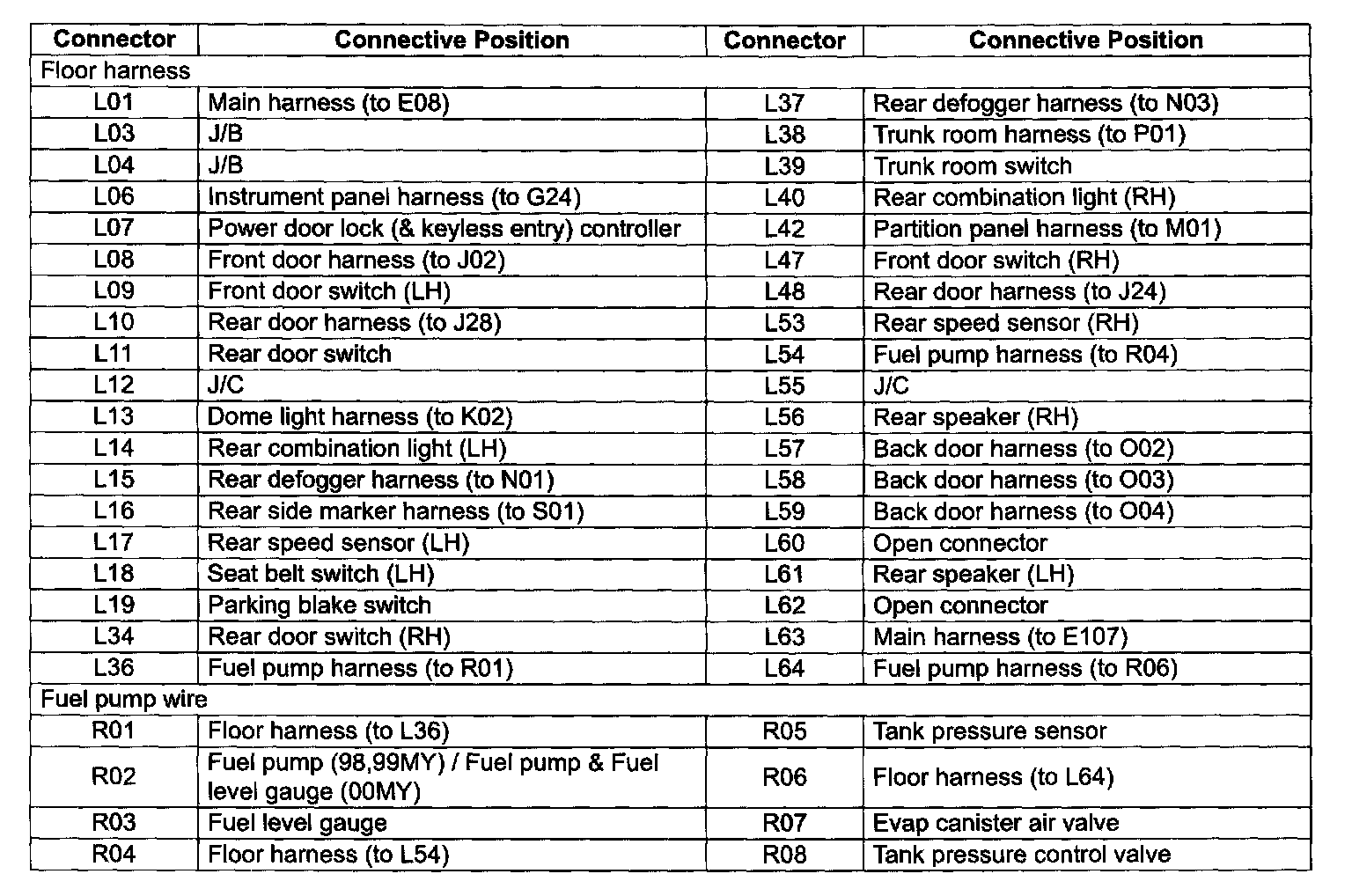 L: Floor Harness R: Fuel Pump Harness (For Sedan, Wagon) Connective Position: