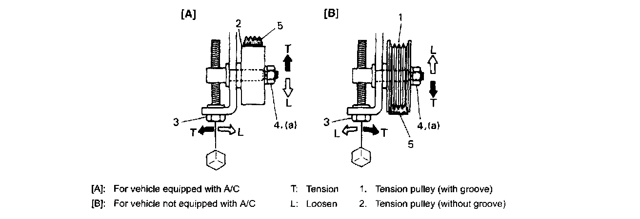2) Adjust belt (5) tension. With A/C equipped vehicles, turning tension bolt (3) counterclockwise causes pulley to rise, increasing belt tension. With A/C non-equipped vehicles, turning tension bolt clockwise causes pulley to lower, increasing belt tension. In both cases, turning tension bolt in the other way decreases belt tension. Be sure to tighten tension nut (4) after adjusting belt tension.