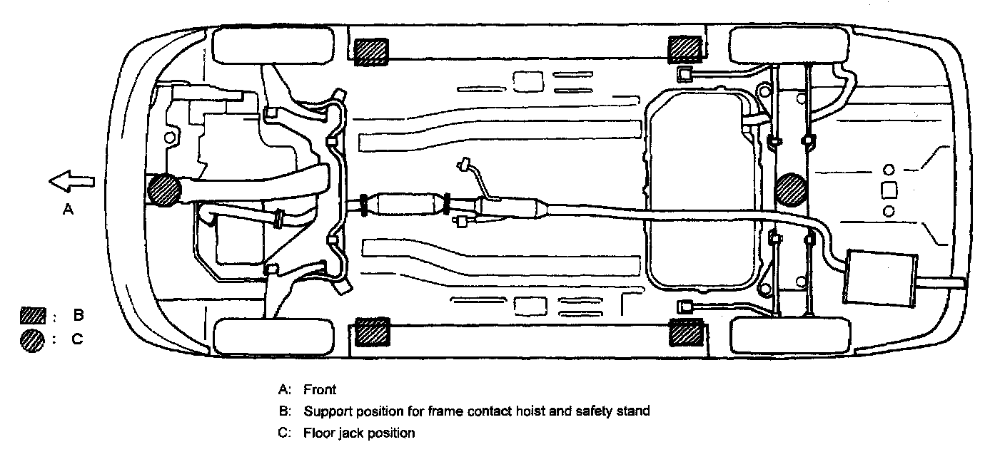 To perform service with either front or rear vehicle end jacked up, be sure to place safety stands under body so that body is securely supported. And then check to ensure that body does not slide on safety stands and the vehicle is held stable for safety's sake.