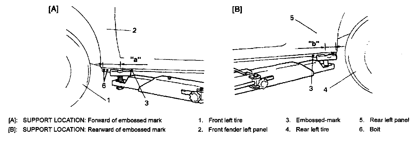 - When using frame contact hoist, apply hoist as shown in the figure (right and left at the same position). Lift up the vehicle till 4 tires are a little off the ground and make sure that the vehicle will not fall off by trying to move vehicle body in both ways. Work can be started only after this confirmation.