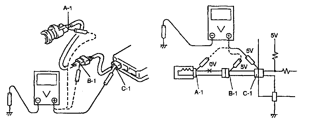 Also, if measured values were as listed below, it means that there is a resistance (abnormality) of such level that corresponds to the voltage drop in the circuit between terminals "A-1" and "B-1".