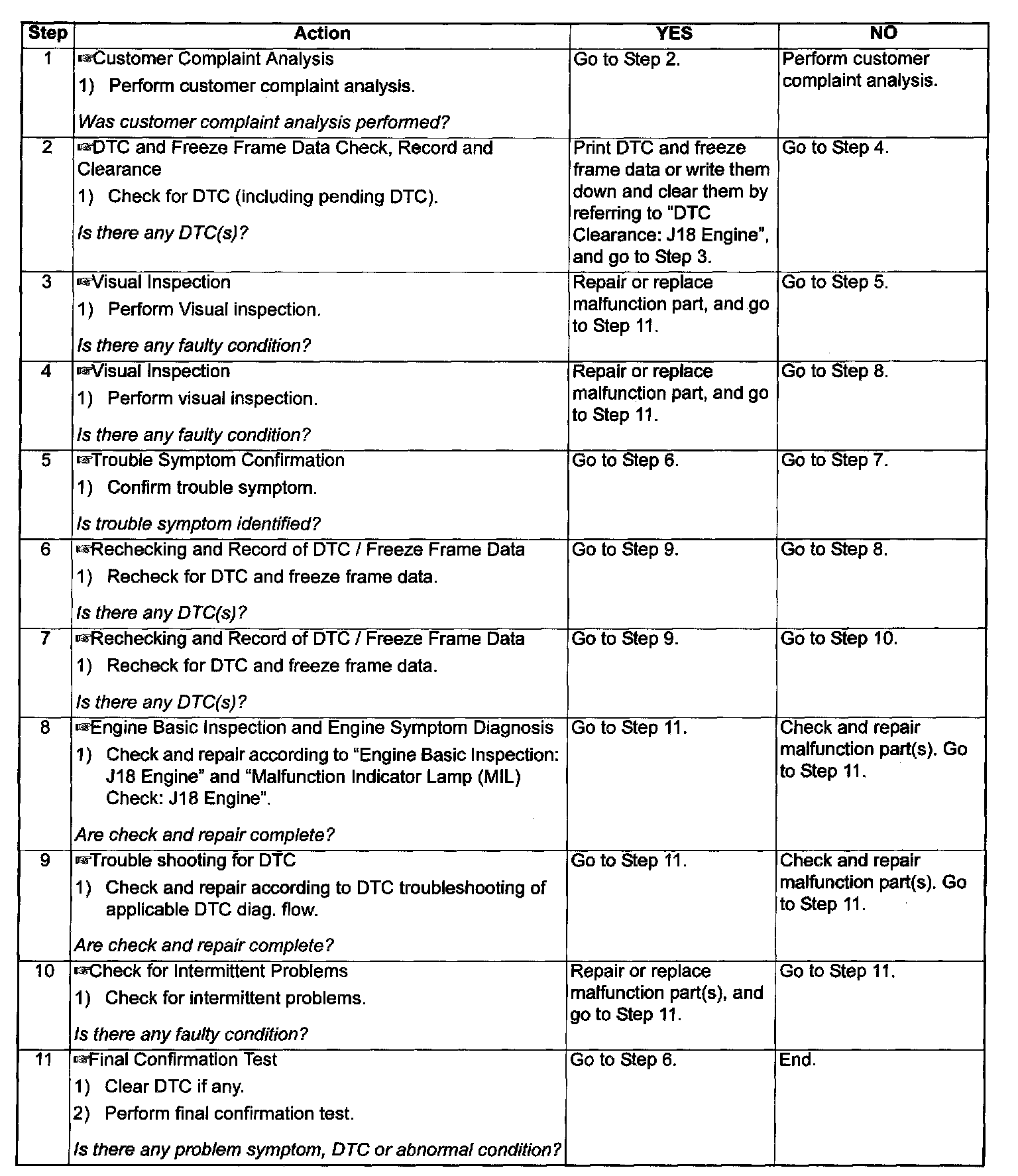 Perform basic engine check according to the "Engine Basic Inspection: J18 Engine" first. When the end of the flow has been reached, check the parts of the system suspected as a possible cause referring to "Malfunction Indicator Lamp (MIL) Check" and based on symptoms appearing on the vehicle (symptoms obtained through steps of customer complaint analysis, trouble symptom confirmation and/or basic engine check) and repair or replace faulty parts, if any.
