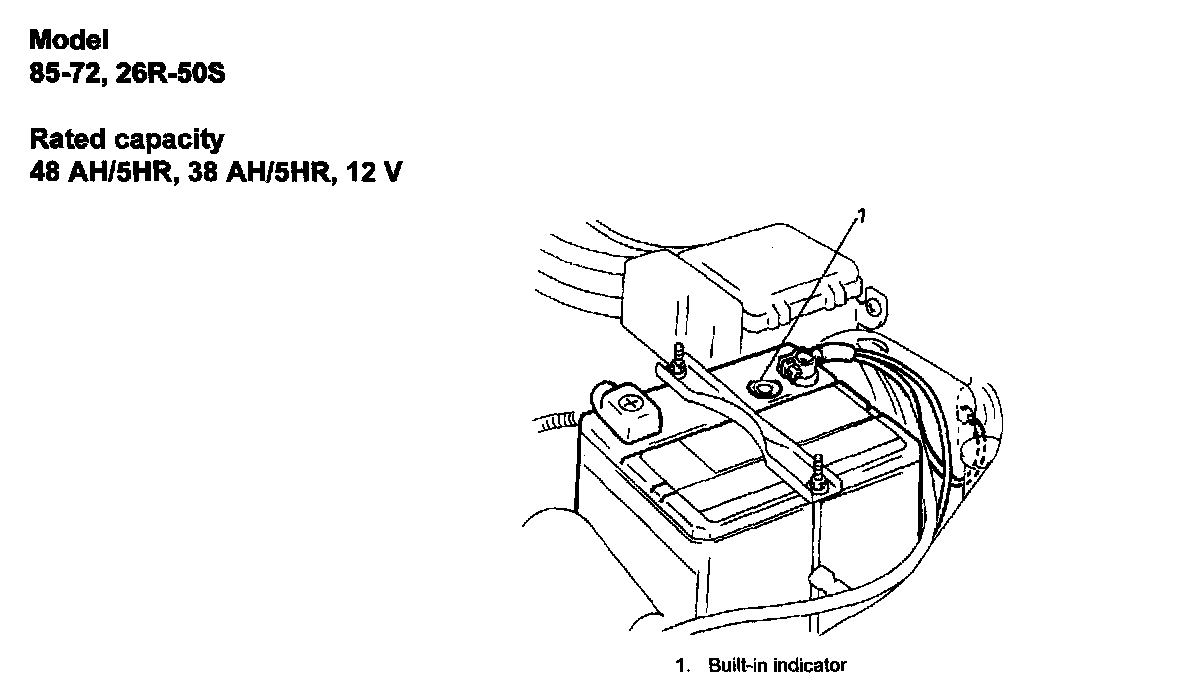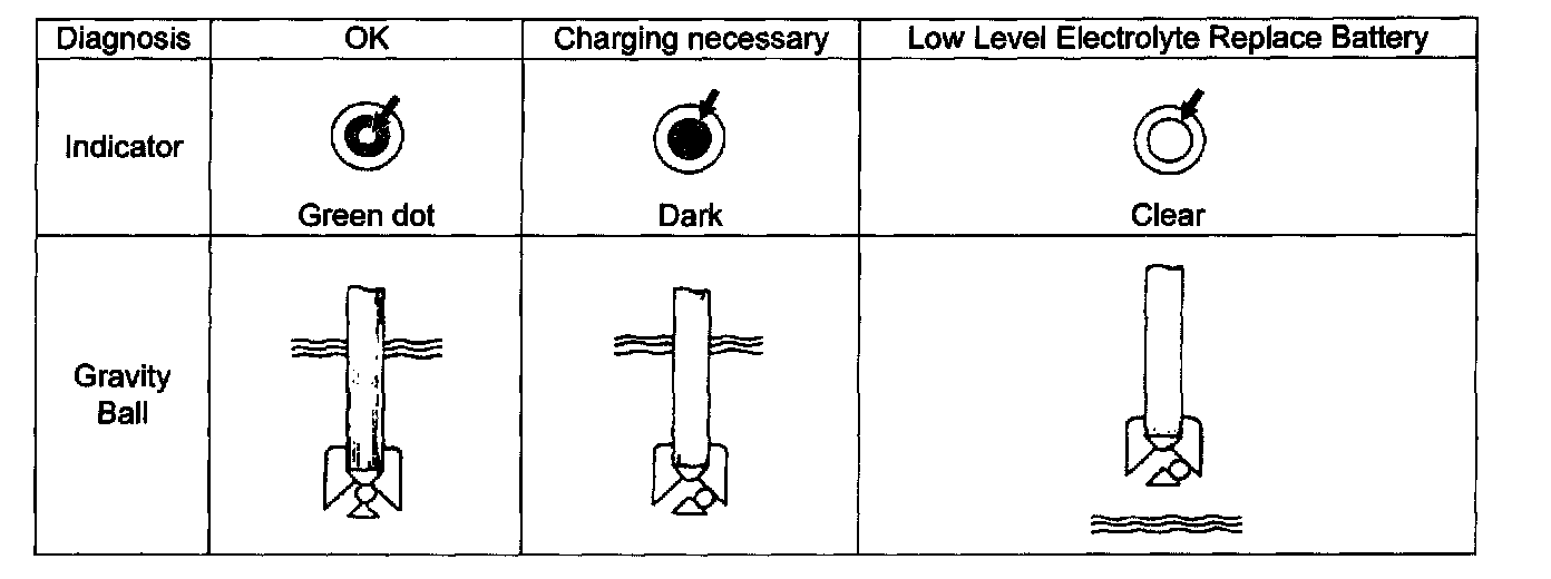 The battery has a built-in temperature compensated indicator in the top of the battery. This indicator is to be used with the following diagnostic procedure. When checking the indicator, make sure that the battery has a clean top. A light may be needed in some poorly-lit areas.