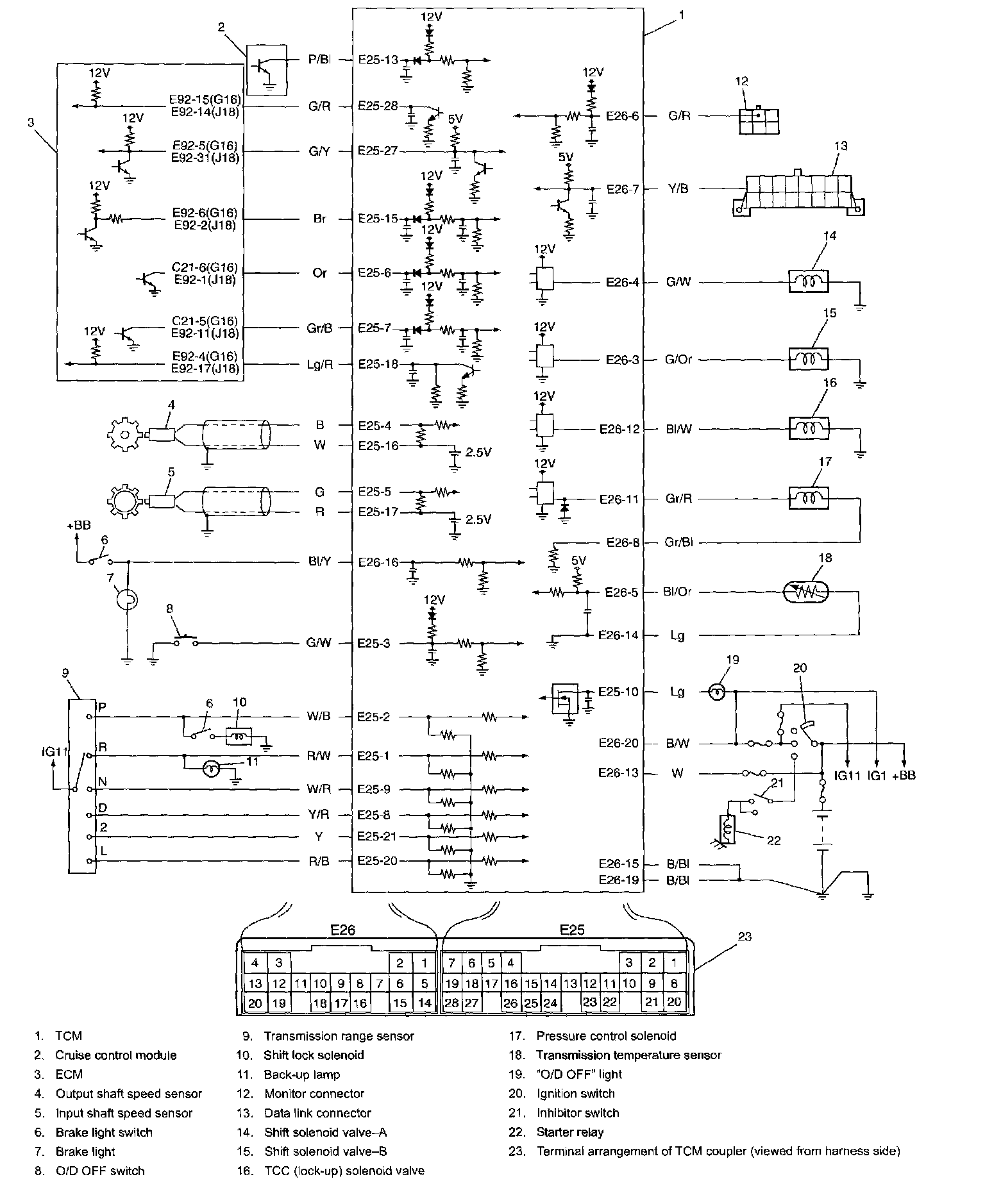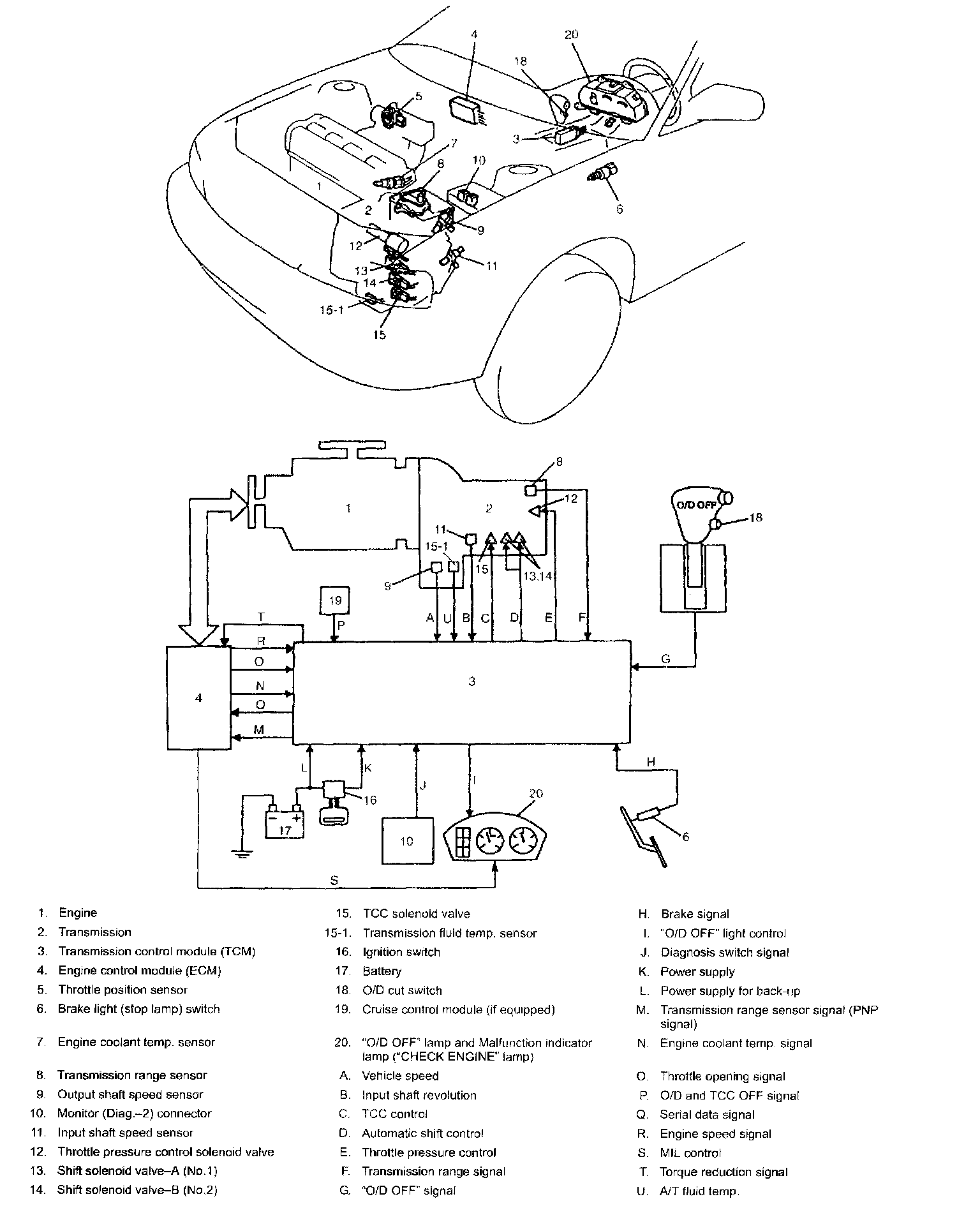 The engine coolant temperature is detected by the engine coolant temperature sensor (1) in engine and emission control system and sent from ECM to TCM as a signal. TCM uses this signal as one of the factors to control gear shift to the 4th (O/D) gear, TCC operation and throttle pressure.