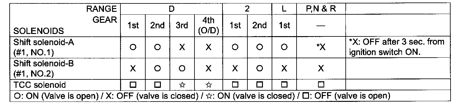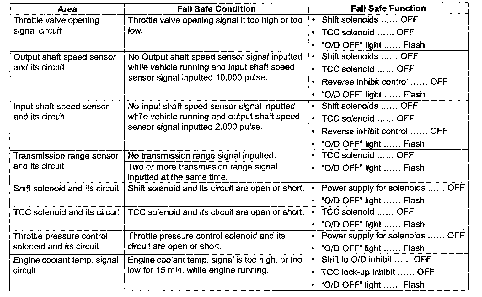 The table shows the fail safe function for each fail condition of sensor, solenoid or its circuit.
