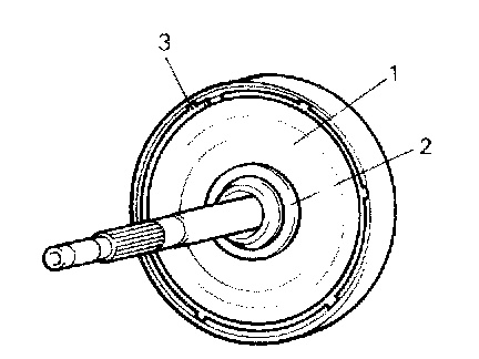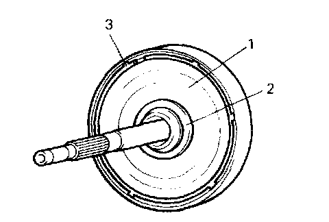 1. Remove sun gear input flange (1) with thrust washer (2) installed by removing retainer ring (3).
