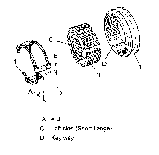 ^ While press-fitting sleeve and hub, make sure that synchronizer ring key slots are aligned with keys in sleeve and hub assembly.