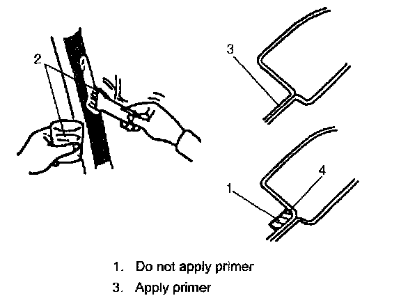 If surfaces of paint or bare metal come out, apply primer (2) for body with caution not to apply primer to surface of adhesive remaining on body.