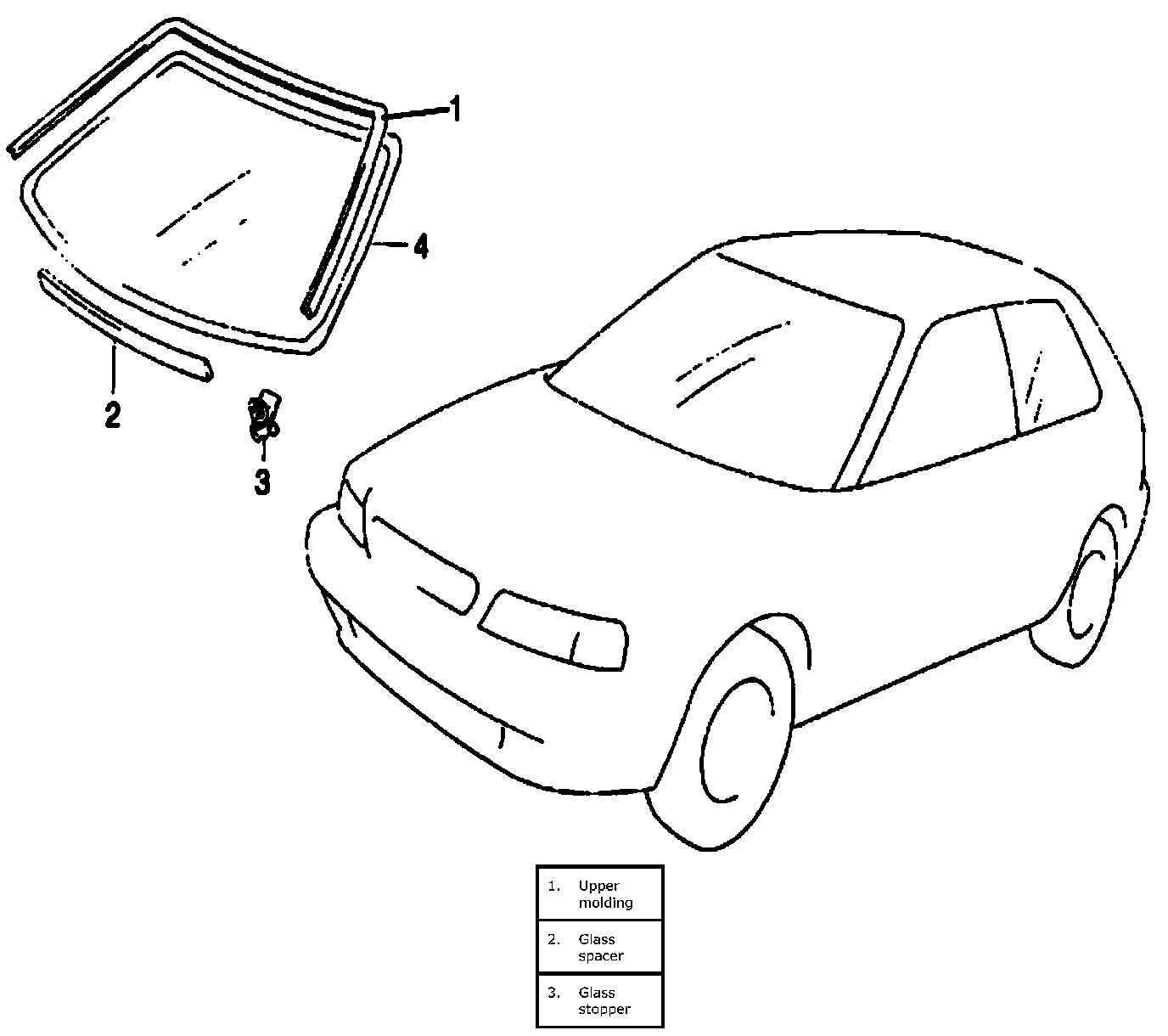 Windshield ConstructionThe windshield (4) is installed by using a special type of adhesive (that is, one component urethane adhesive used with primer). For windshield glass replacement, it is important to use an adhesive which provides sufficient adhesion strength and to follow the proper procedure.