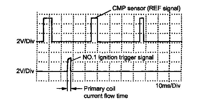 Oscilloscope waveforms of CMP sensor and No.1 ignition trigger signal are as shown in the figure when connecting oscilloscope between terminals "C20-10" of ECM (PCM) connectors connected to ECM (PCM) and ground, and between terminal "E92-34" and ground