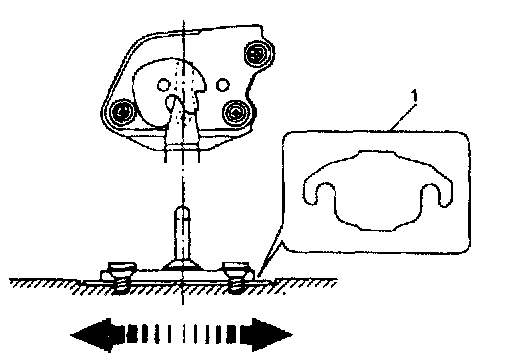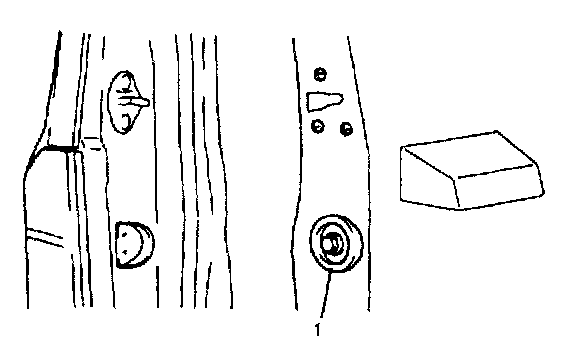 Adjust back door / rear gate latch striker so that its center aligns with the center of groove in back door / rear gate latch base. To adjust back door / rear gate latch and striker with each other, insert proper number of shims (1) below the bottom of striker, as shown.