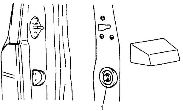 Adjust back door / rear gate latch striker so that its center aligns with the center of groove in back door / rear gate latch base. To adjust back door / rear gate latch and striker with each other, insert proper number of shims (1) below the bottom of striker, as shown.