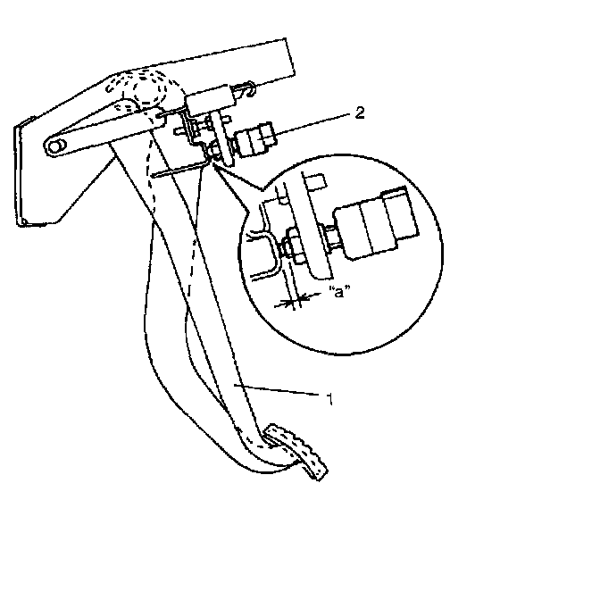 With clutch pedal (1) released, adjust switch (2) position so that clearance between end of thread and clutch pedal bracket is within specification.