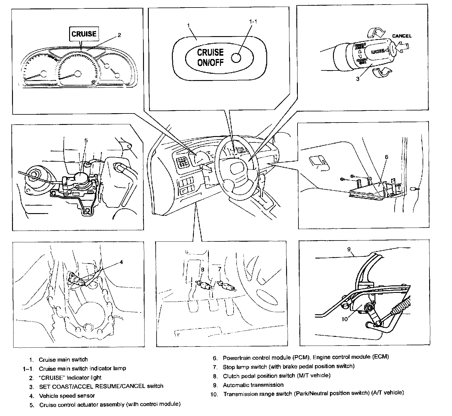 The cruise control system is a device which maintains a preset vehicle speed. while driving at a high speed, e.g., on a highway. It allows the driver to drive his vehicle at a constant speed of 40 km/h (25 mile/h) or higher without depressing the accelerator pedal (constant cruising). The system also has such functions as to change the vehicle speed without operating the accelerator pedal (but using SET COAST and ACCEL RESUME switches), cancel cruise control (CANCEL switch) and resume the speed in memory automatically after cruise control is cancelled (ACCEL RESUME switch). The system mainly consists of a vehicle speed sensor, an actuator assembly incorporated with control module, cruise main switch, SET COAST switch, ACCEL RESUME switch and CANCEL switch, etc.