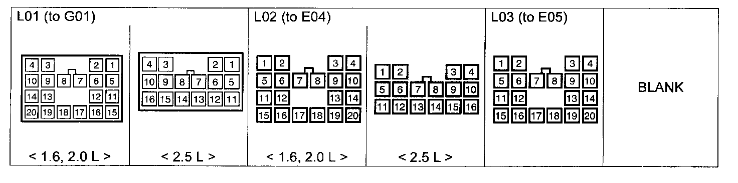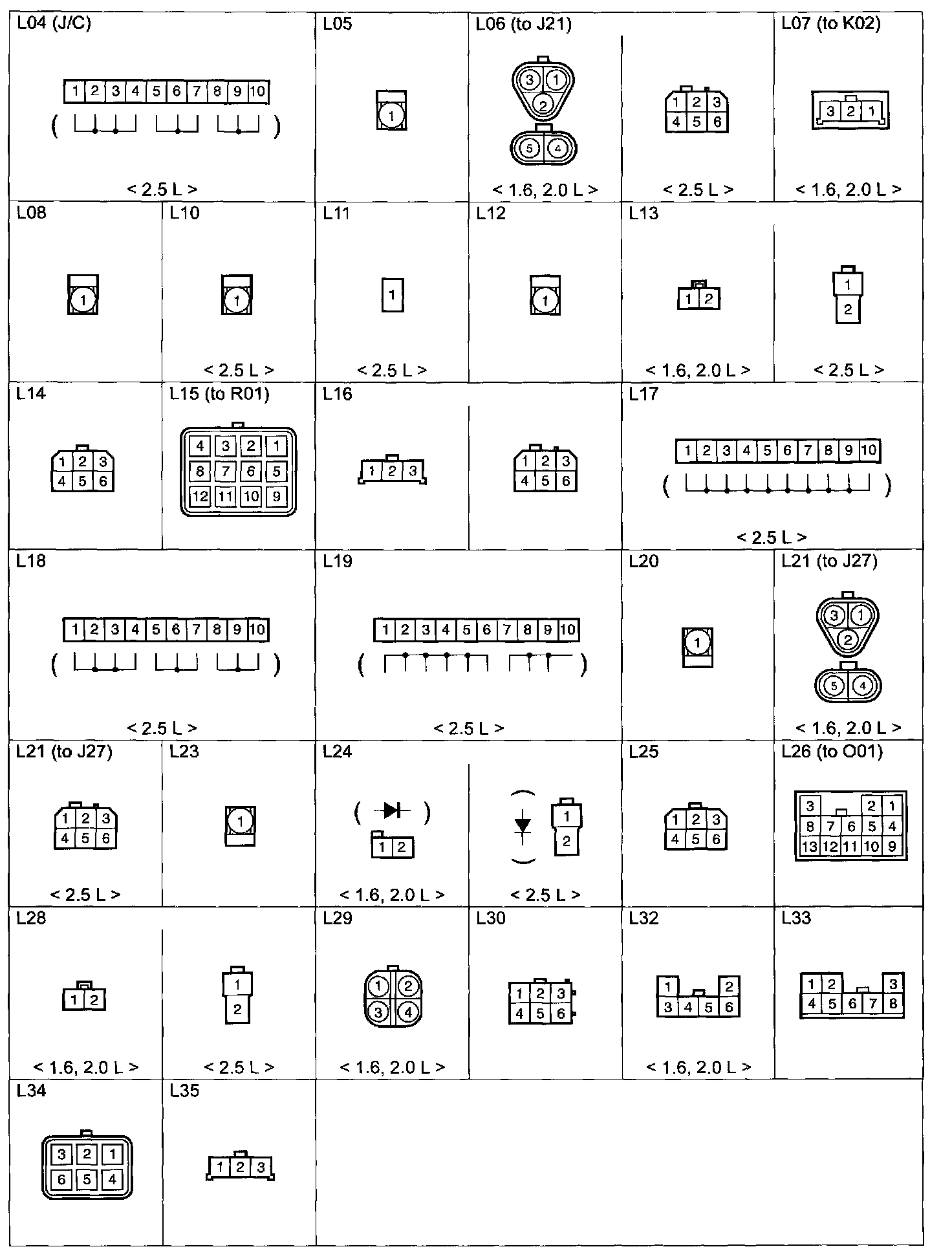 The illustrations below show the harness side connectors, but not the component side connectors.
