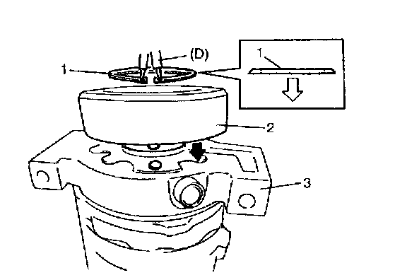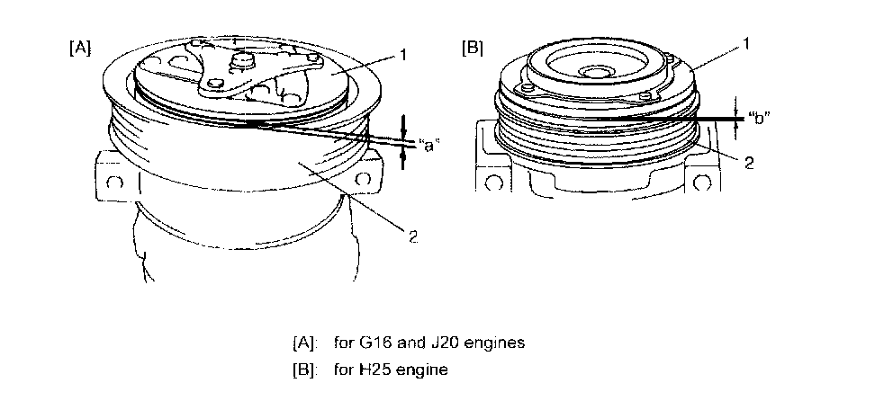 5. Adjust clearance, between armature plate (1) and magnet clutch (2) by putting shim on compressor shaft.