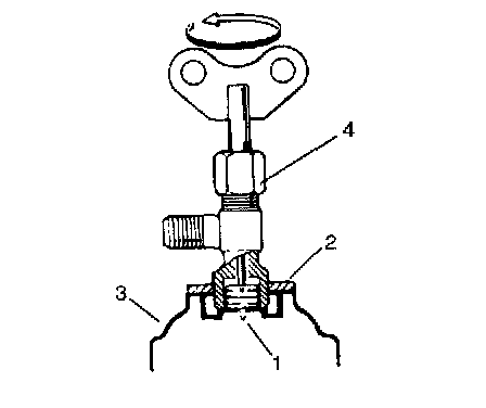 i. Retract needle (1)and remove refrigerant container tap valve (4) by loosening its plate nut (2).