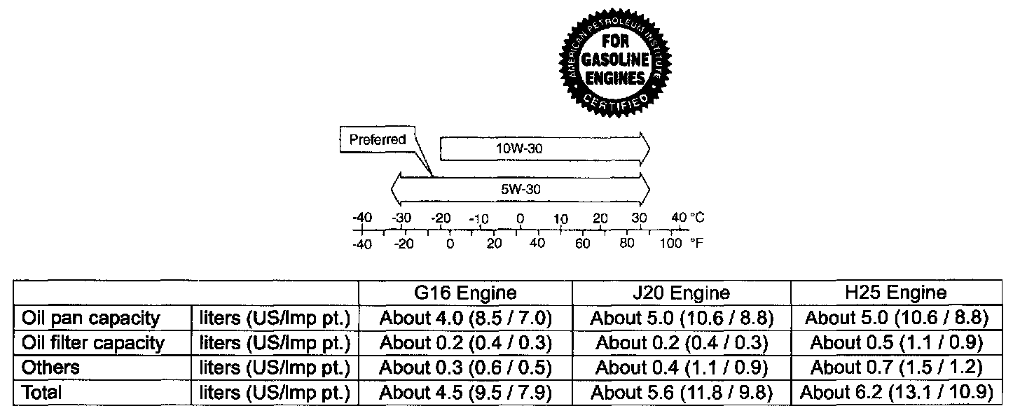 NOTE: Engine oil capacity is specified. However, note that the amount of oil required when actually changing oil may somewhat differ from the data in the table depending on various conditions (temperature, viscosity, etc.)