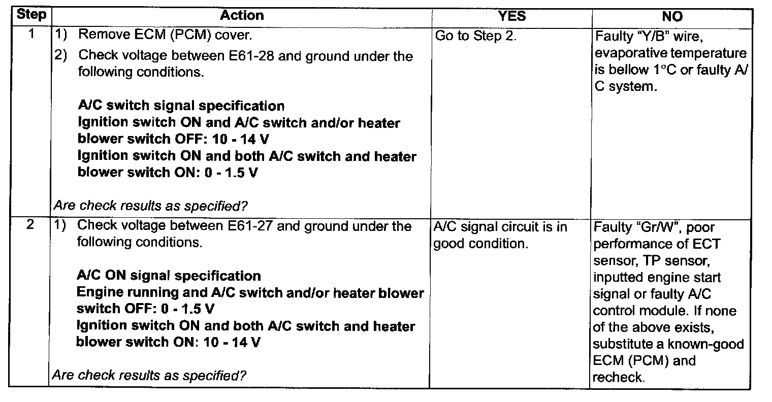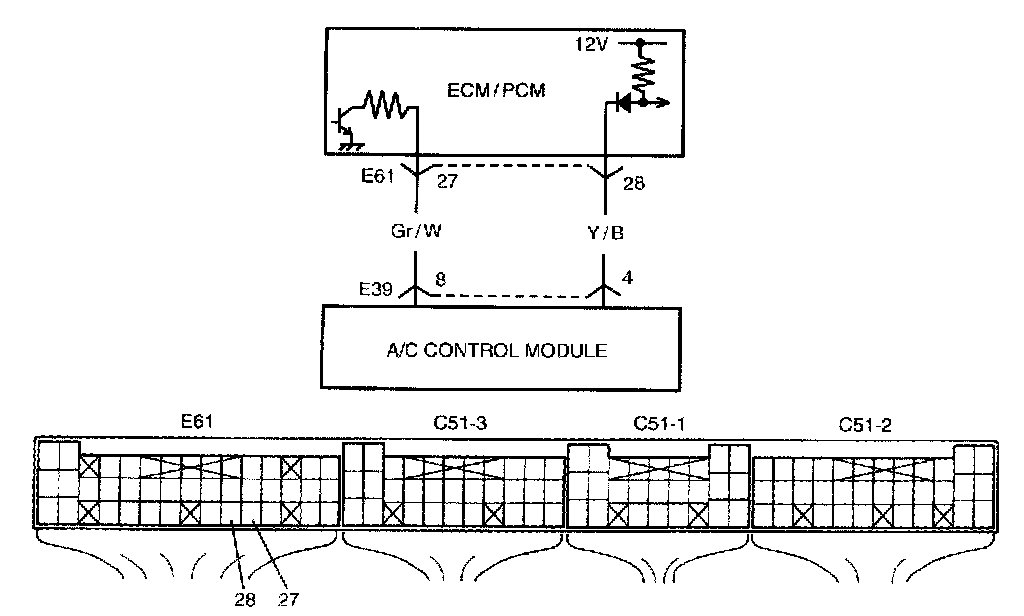 ECM (PCM) outputs A/C ON signal (one of the signals for A/C control module to control the A/C) to A/C control module when A/C switch signal inputted to ECM (PCM) and engine conditions are specified.