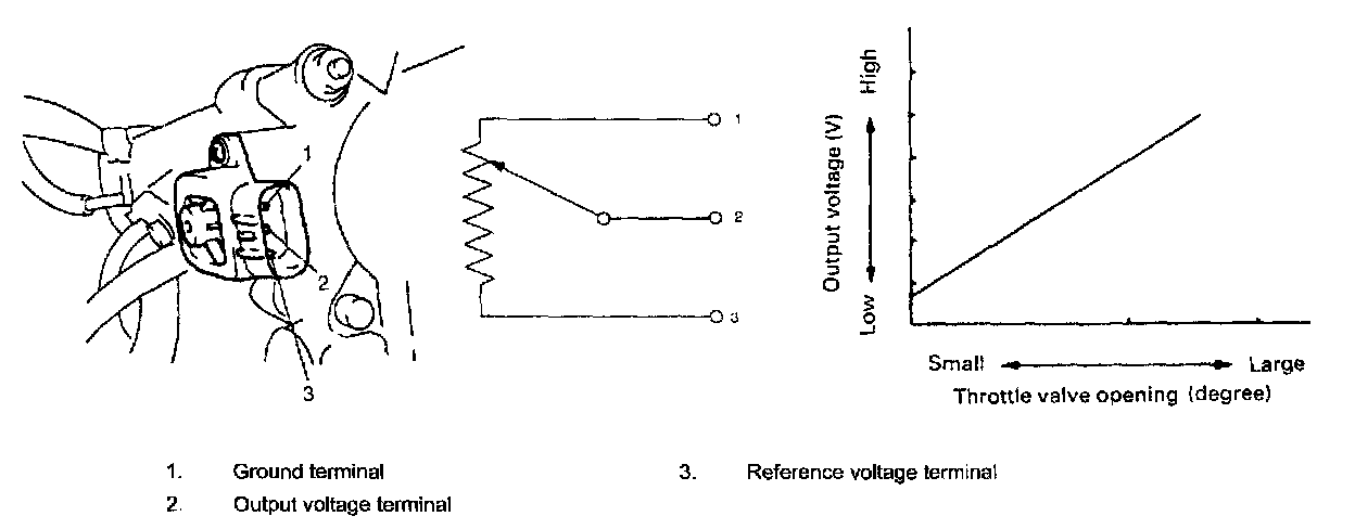 A 5-volt reference voltage is applied to the sensor from ECM (PCM) and as its brush moves over the print resistance according to the throttle valve opening, the output voltage varies accordingly.