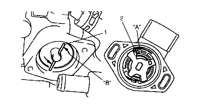 1. To install sensor, place it onto throttle body so that sensor pickup lever (2) can engage with throttle body lever (1). "A" should engage with "B".