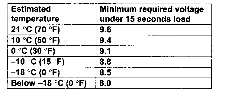 NOTE: Temperature of battery will affect minimum voltage required to pass load test. See the figure and estimate the temperature battery has been exposed to for the last several hours. Battery load test voltage