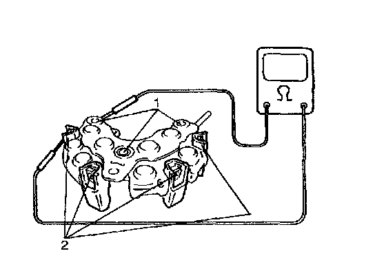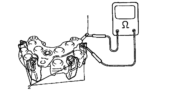 1. Using ohmmeter, check continuity between each of upper and lower rectifier bodies and each diode lead (2). Check both directions by reversing probes of ohmmeter and there should be only one-way continuity in each case. If check result is not satisfactory, replace rectifier (1).