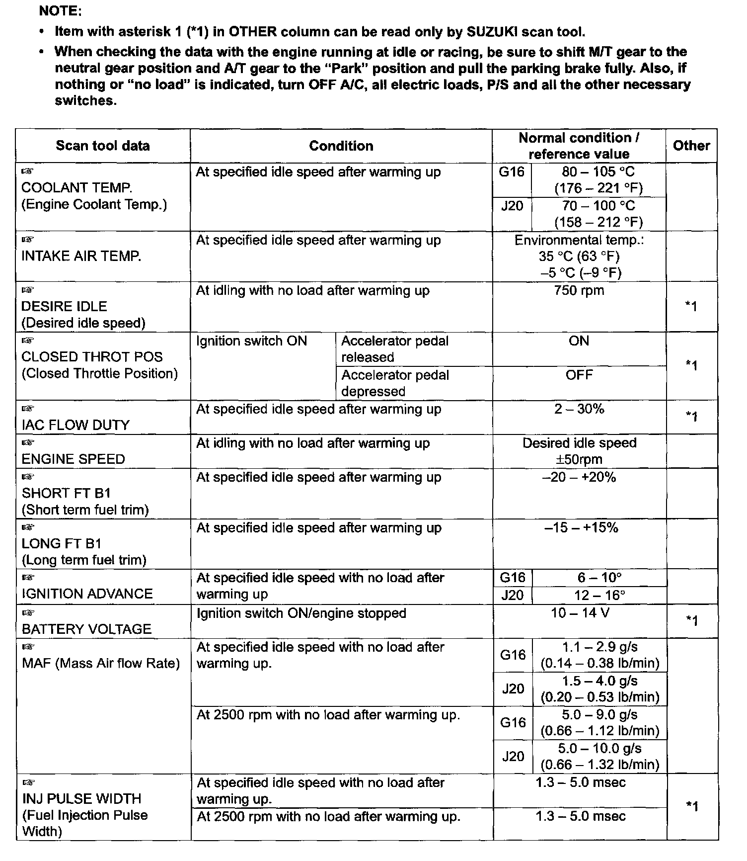 Also, conditions in the table that can be checked by the scan tool are those output from ECM (PCM) as Commands and there may be cases where the engine or actuator is not operating (in the condition) as indicated by the scan tool. Be sure to use the timing light to check the ignition timing.