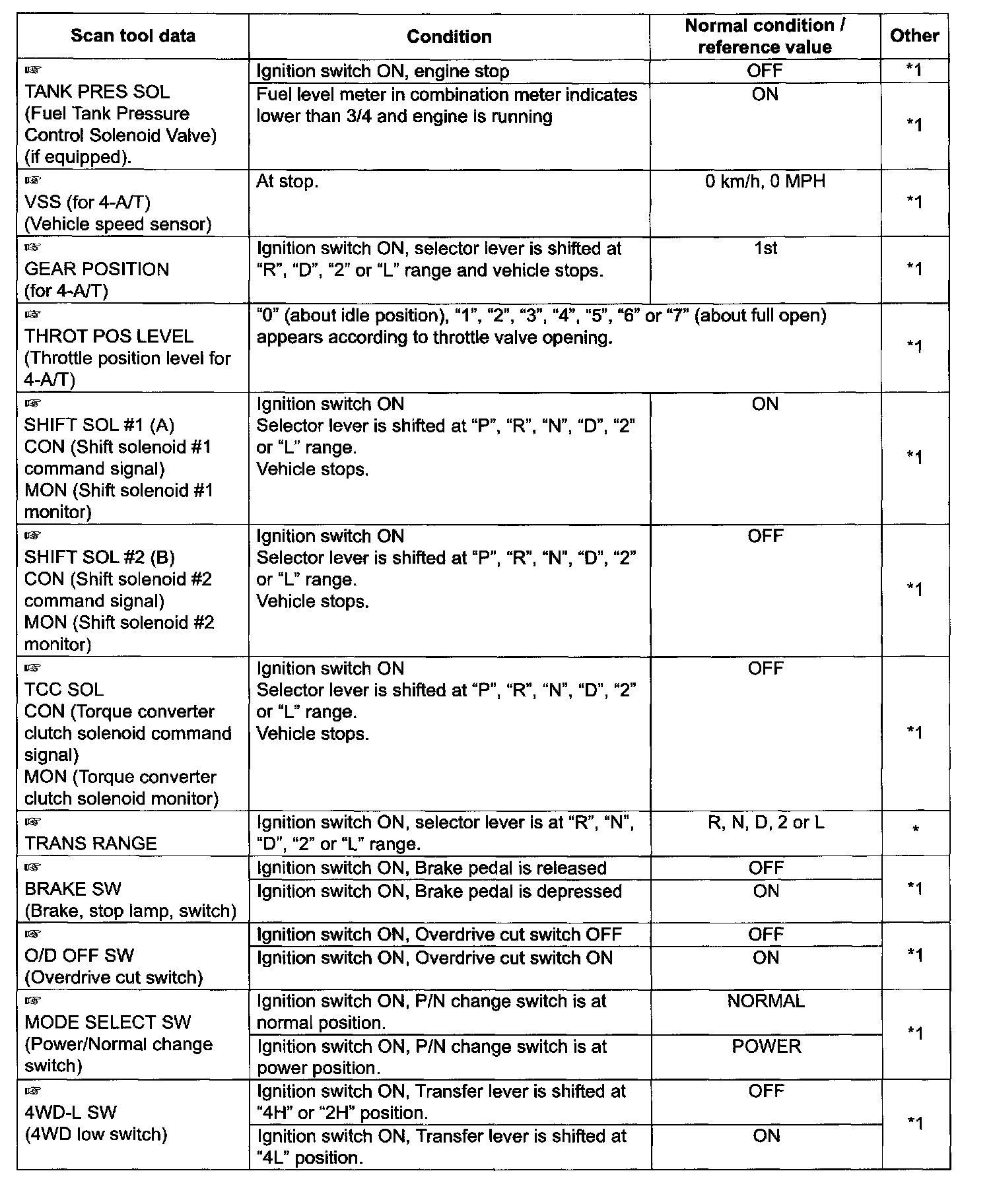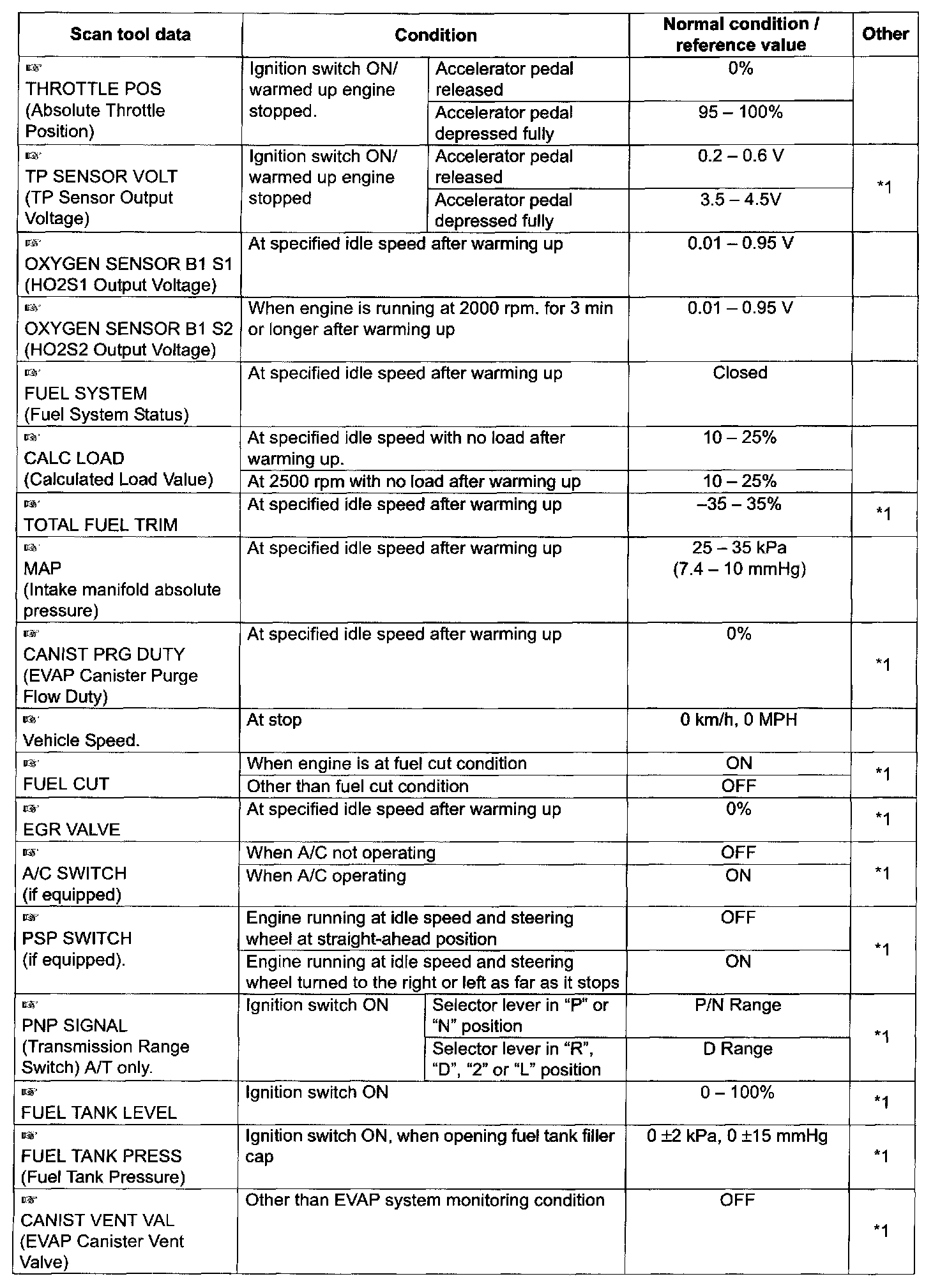 As the data values given are standard values estimated on the basis of values obtained from the normally operating vehicles by using a scan tool, use them as reference values. Even when the vehicle is in good condition, there may be cases where the checked value does not fall within each specified data range. Therefore, judgment as abnormal should not be made by checking with these data alone.