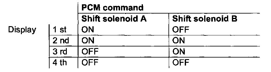 GEAR POSITION (1ST, 2ND, 3RD or 4TH): The gear position is determined on the basis of the command state signals generated from PCM (ECM) to shift solenoids A and B (#1 and #2) and displayed as shown in the table.