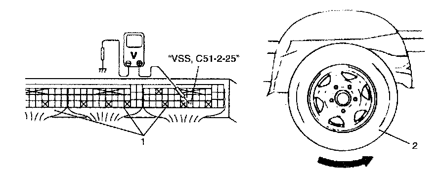 Voltmeter should indicate deflection between 0 - 1 V and 8 - 14 V a few times while tire is turned one revolution.