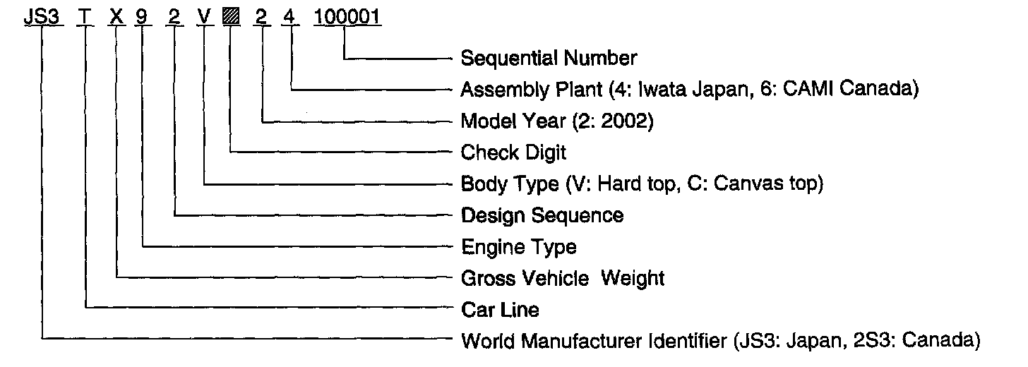 The vehicle identification number is on the left side of instrument panel. Refer to the figure for detailed VIN cord information and its location.