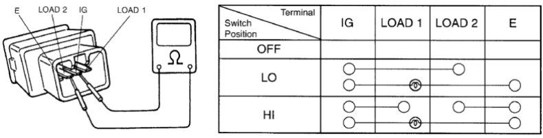 4. Check for continuity between terminals at each switch position as shown below. If check result is not as specified, replace.