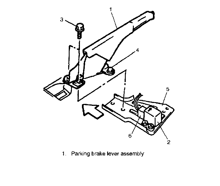 2. Install sensor (4) with bracket (6) and parking lever assembly (3) onto floor so that arrow mark (1) directs vehicle forward (2).