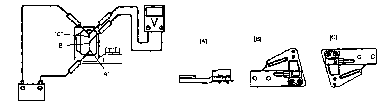 2. Connect positive cable of 12 volt battery to "A" terminal of sensor and ground cable to "C" terminal. Then using voltmeter, check voltage between "B" terminal and "C" terminal. If measured voltage is not as specified, replace sensor with bracket.
