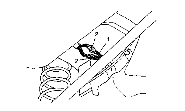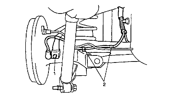 3. Disconnect rear wheel speed sensor connector (2) and detach wire harness (1) from vehicle body and rear axle.