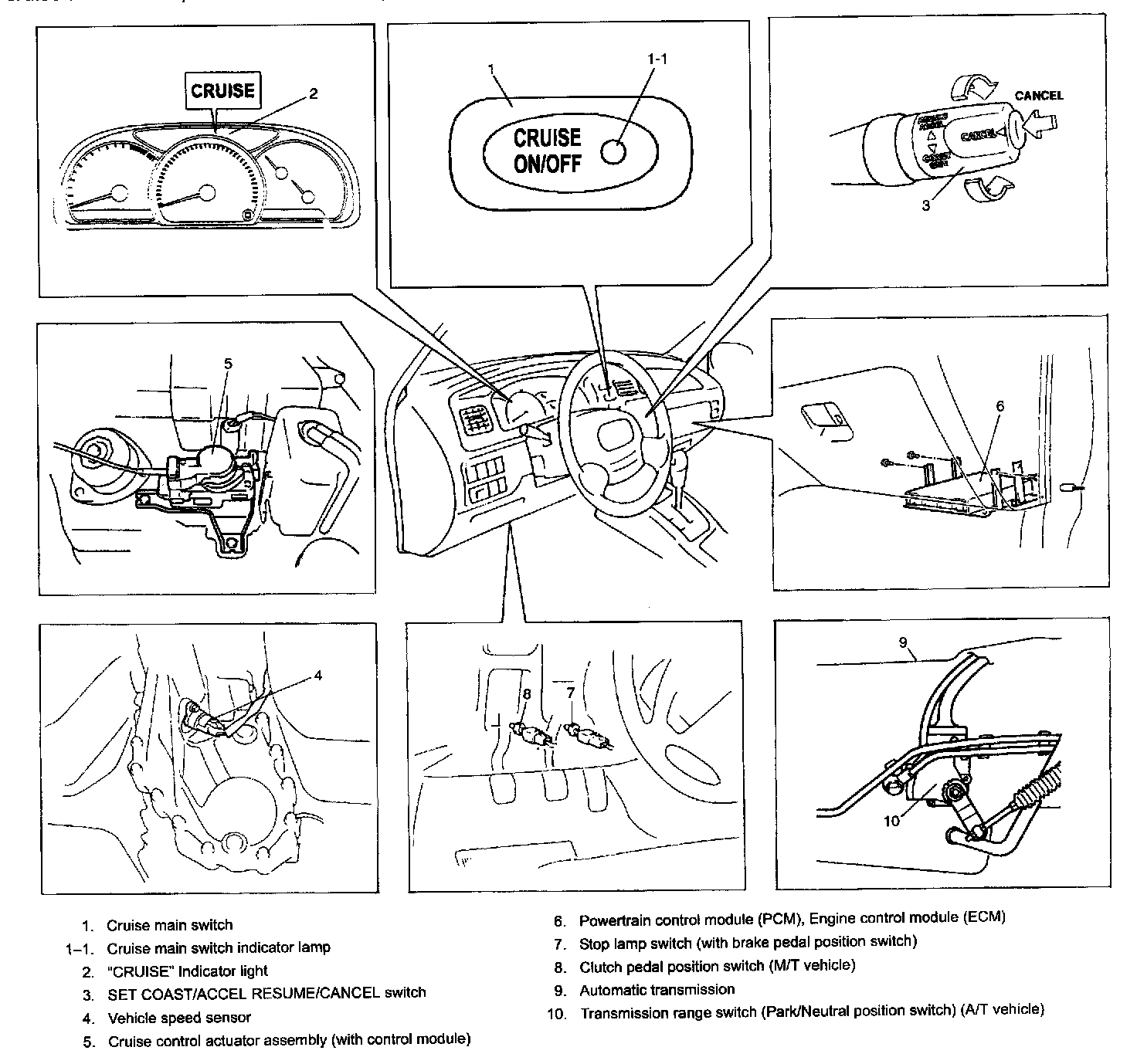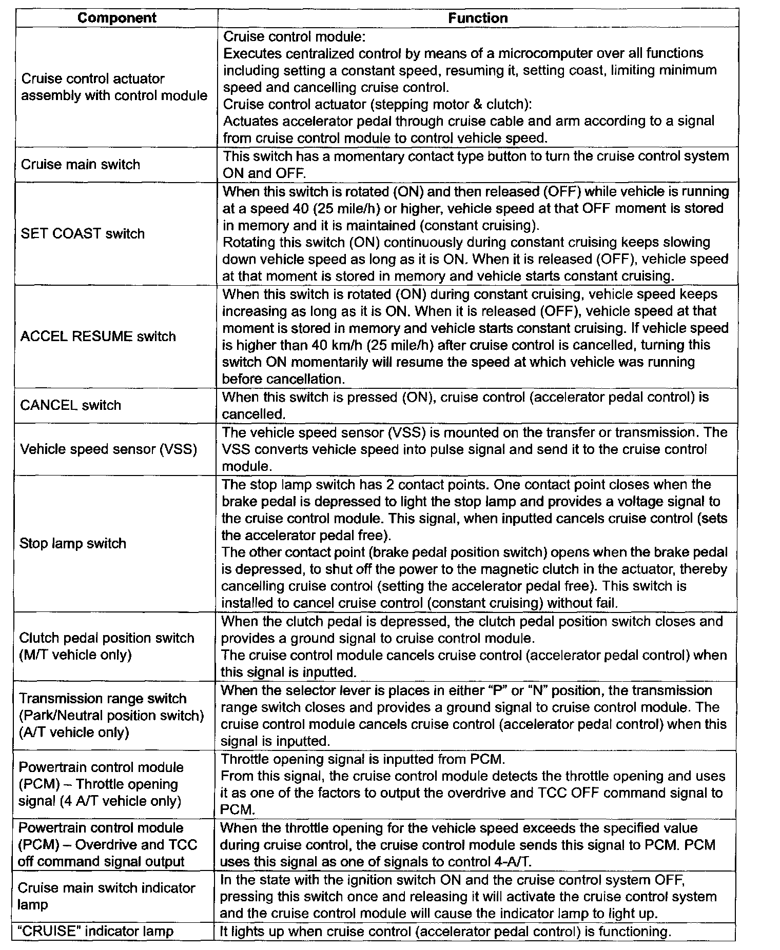 The cruise control system is a device which maintains a preset vehicle speed while driving at a high speed, e.g., on a highway. It allows the driver to drive his vehicle at a constant speed of 40 km/h (25 mile/h) or higher without depressing the accelerator pedal (constant cruising). The system also has such functions as to change the vehicle speed without operating the accelerator pedal (but using SET COAST and ACCEL RESUME switches), cancel cruise control (CANCEL switch) and resume the speed in memory automatically after cruise control is cancelled (ACCEL RESUME switch). The system mainly consists of a vehicle speed sensor, an actuator assembly incorporated with control module, cruise main switch, SET COAST switch, ACCEL RESUME switch and CANCEL switch, etc.