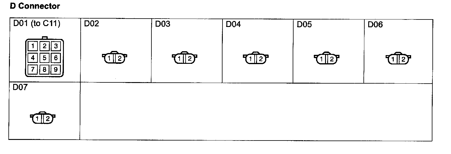 The illustrations below show the harness side connectors, but not the component side connectors.
